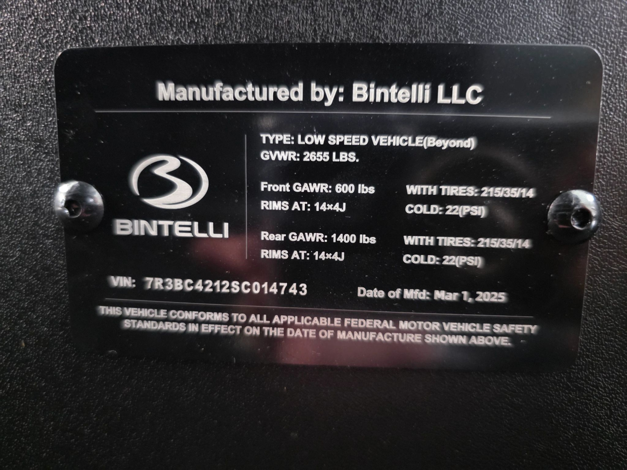 2025 Bintelli Beyond 6L STREET-LEGAL LSV 105AH